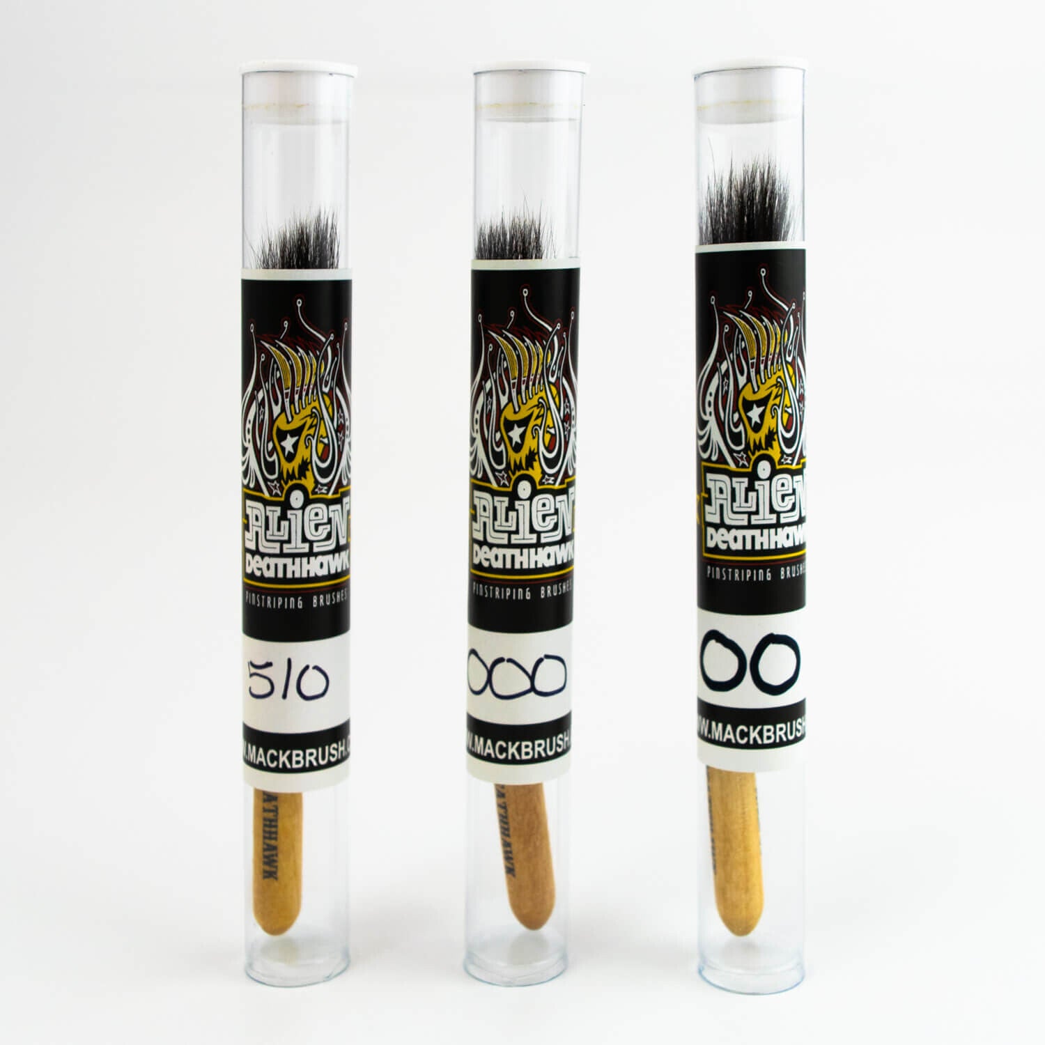 Andrew Mack & Son Brush Company has teamed up with Todd Hanson to create another pinstriping brush series called the “Alien Deathhawk” which is offered in sizes 5/0, 3/0, and 2/0. This brush has all the same specifications as the King 13, but instead of using Chinese blue squirrel hair we have used the European dressed blue squirrel hair. The European dressed blue squirrel hair is a stiffer hair which will give the striper more body without as much droop when you have a fully loaded brush. We use a 60mm European dressed blue squirrel hair for the 5/0 and 3/0 giving the brush a total hair length of 1 3/4″. We use a 65 mm hair length for the 2/0 which gives the brush a total hair length of 2″. The brush has more pull in the making process giving it a little more taper than a traditional striper. The amount of hair that is distributed onto the handle during the making process is configured differently then our series 10 and 20 brushes. For example, the 5/0 and 3/0 are made on a 2/0 handle and the 2/0 is made on a 0 handle. Our brush makers are applying the same amount of hair for say a 00 brush but putting it on a handle that has a larger surface area.